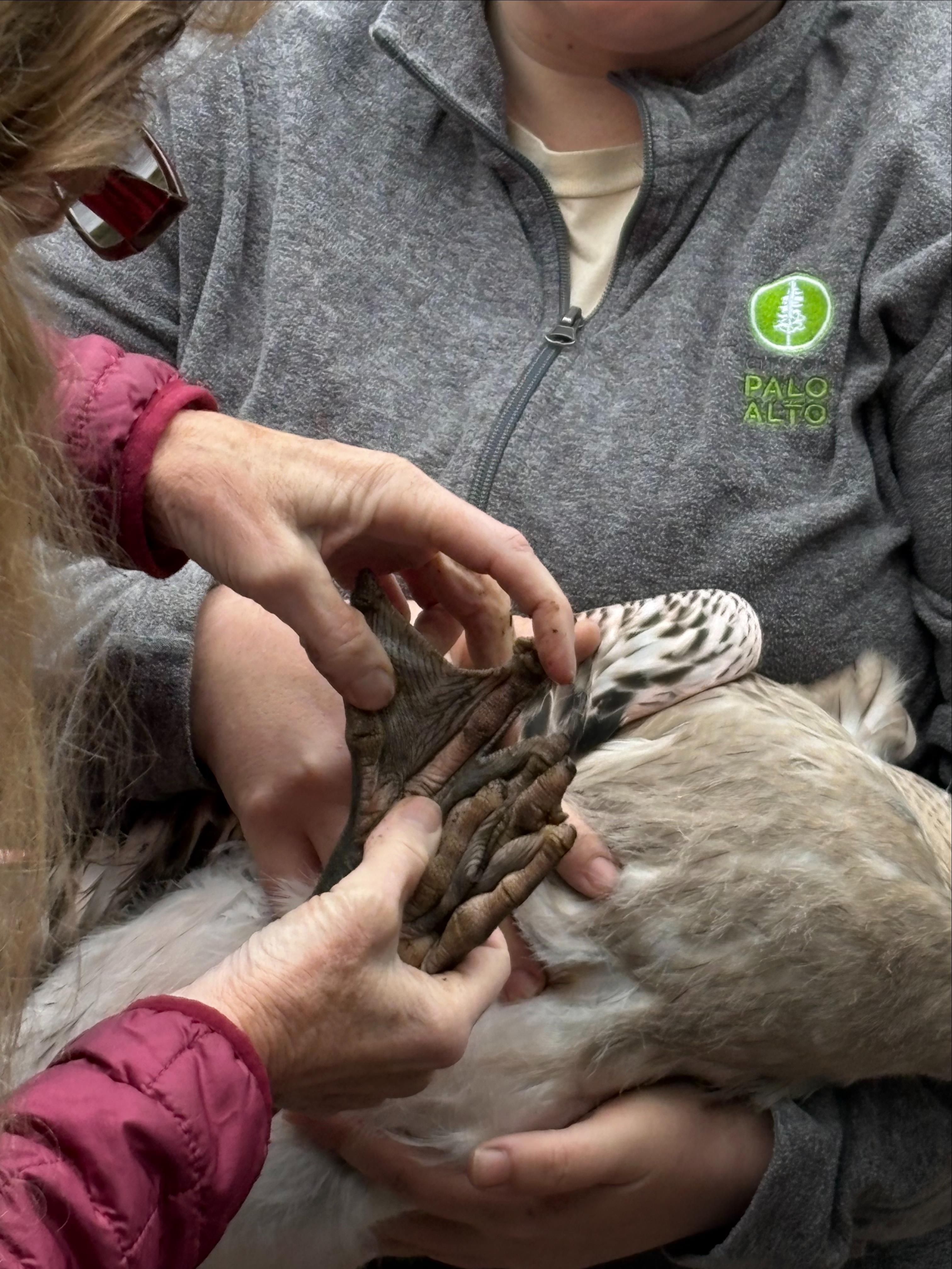 Close up of staff examining webbed foot of baby flamingo.