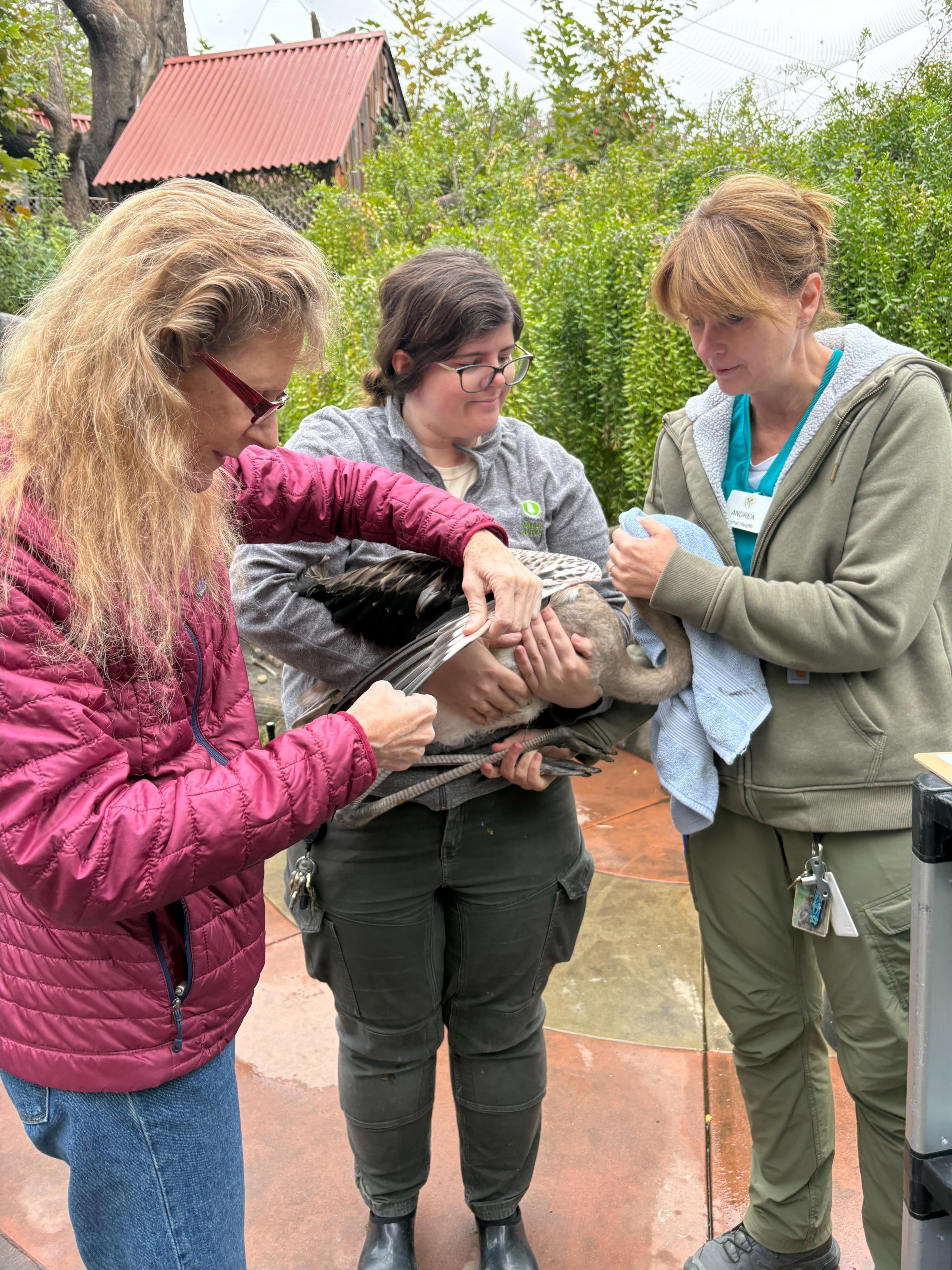 Tina, Mary, and Andrea carefully perform a physical exam on the baby flamingo.